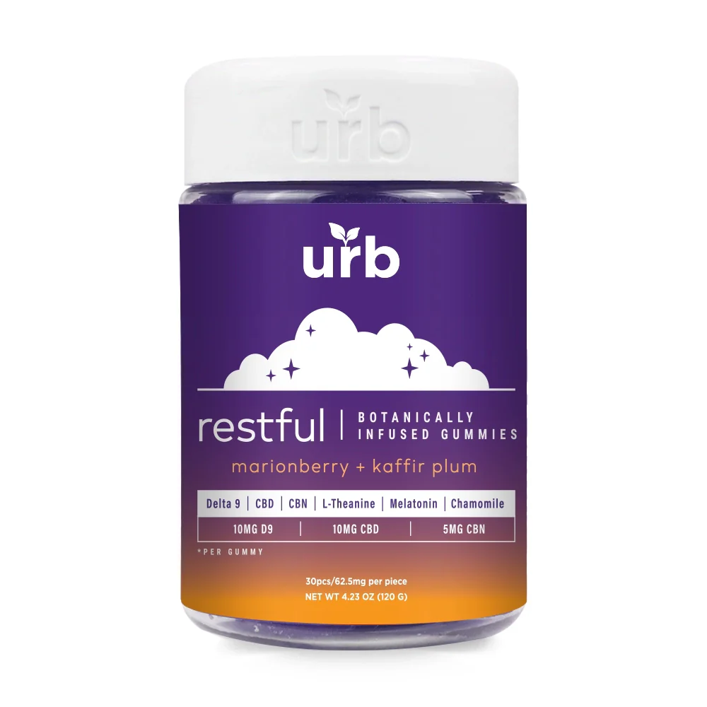 Urb Restful Botanically Infused Gummies | D9+CBD+CBN+L-Theanine+Melatonin+Chamomile | 1875mg | 30 Jar | MARIONBERRY + KAFFIR PLUM